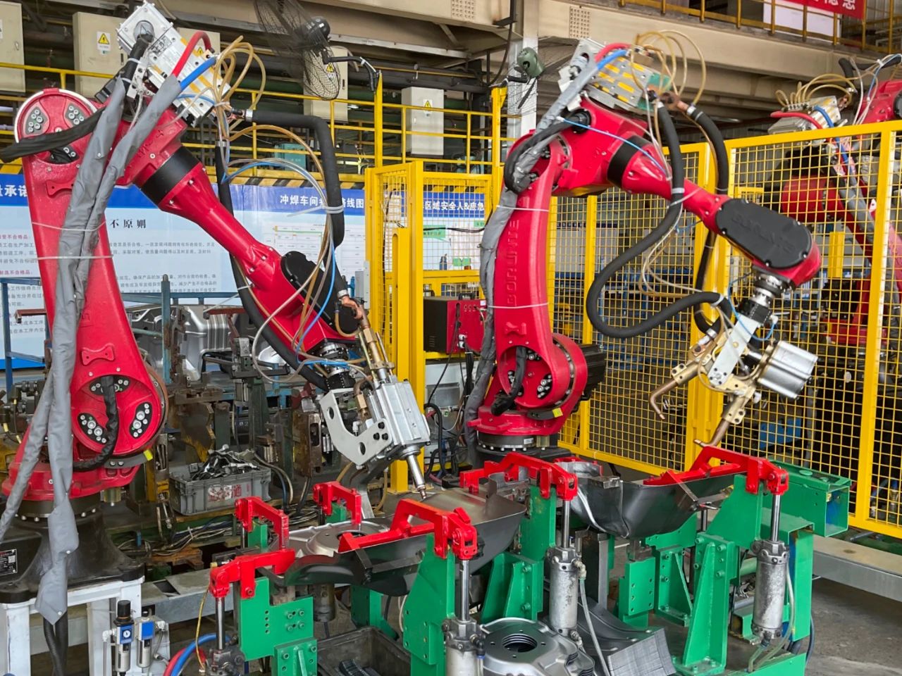 對此,重慶卓通于今年3月起迅速組建跨部門專班,依托沖焊車間現(xiàn)有場地,采用"國產(chǎn)機器人+自主集成"的模式對當前產(chǎn)線進行創(chuàng)新改造。面對工裝夾具設(shè)計、焊鉗選型、參數(shù)匹配等技術(shù)瓶頸,項目團隊進行了多輪技術(shù)論證與虛擬仿真模擬,最終確定了"5臺輕載機器人+雙工位協(xié)同"的改造方案,減少工裝切換,提升效率。