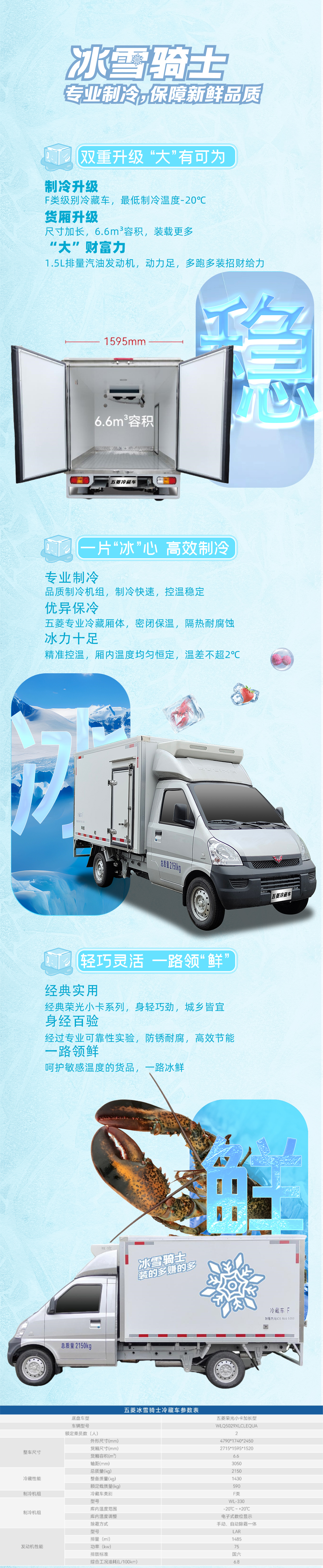 五菱冷藏車——冰雪騎士,F(xiàn)類級(jí)別,平均制冷溫度≤-20℃,制冷快,控溫穩(wěn),榮光小卡加長(zhǎng)系列,1.5L排量汽油發(fā)動(dòng)機(jī),6.6m3專業(yè)冷藏貨廂,多跑多裝才是硬實(shí)力!