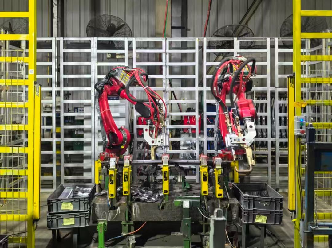 為了快速推進項目落地,設(shè)備運行團隊聯(lián)動沖焊車間開展發(fā)罩內(nèi)板自動化產(chǎn)線改造。設(shè)備工程師提前學習機器人應用、機器人與PLC進行modBusTCP通訊配置學習,同時開展電氣系統(tǒng)規(guī)劃設(shè)計和物料清單采購,設(shè)備工裝設(shè)計師進行機器人底座設(shè)計自制和焊鉗選型模擬,聯(lián)合維修團隊完成產(chǎn)線布局、電氣控制系統(tǒng)接線、自動化集成調(diào)試等系列工作;沖焊車間車間負責工藝參數(shù)調(diào)整及產(chǎn)線圍欄安裝。經(jīng)改造,單班減少用工2人,產(chǎn)品質(zhì)量得到進一步提升。
