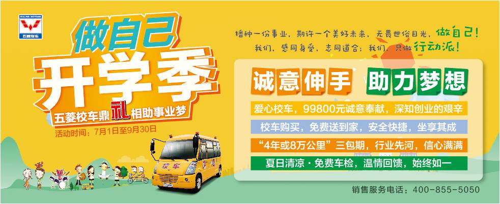 為了助力廣大正在為教育事業(yè)打拼的創(chuàng)業(yè)者一臂之力,成就教育事業(yè)夢想。同時(shí)也為了進(jìn)一步助推中國校車的普及,讓更多的學(xué)齡兒童,尤其是經(jīng)濟(jì)欠發(fā)達(dá)地區(qū)的學(xué)齡兒童乘坐上安全的新國標(biāo)專用校車。五菱校車定于2015年7月1日至9月30日期間,在全國范圍內(nèi)開展“開學(xué)季,做自己!——五菱校車鼎禮相助事業(yè)夢”助力活動。