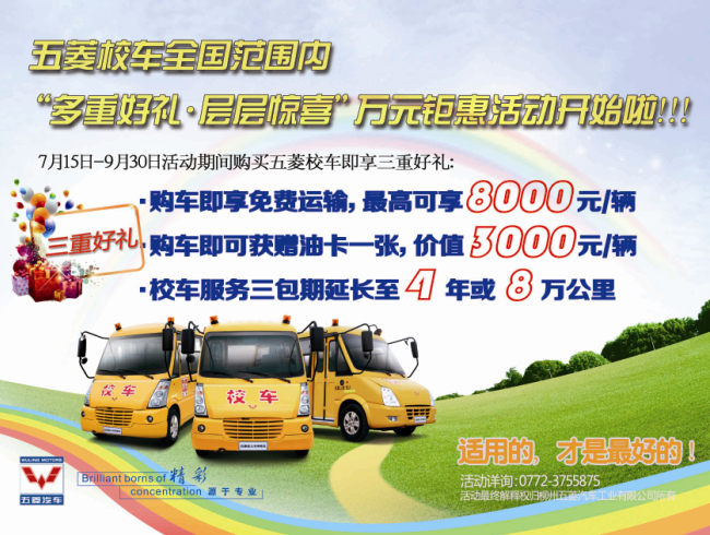 凡在2014年7月15日至9月30日期間,全國(guó)范圍內(nèi)購(gòu)買五菱校車的客戶,均可享受3重好禮: